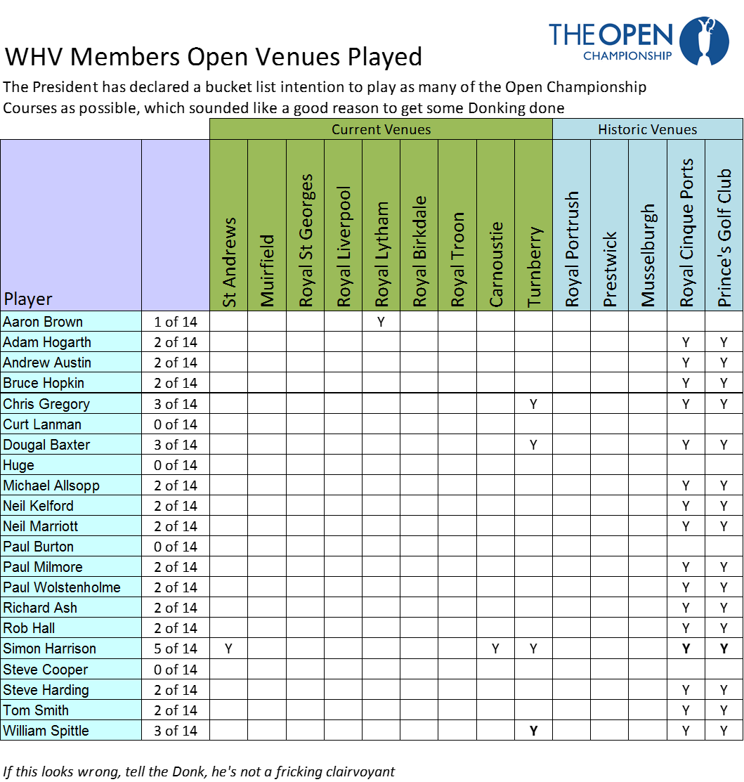 I started this in June after a car full of us played Turnberry. I suspect that Rob and Ron will update their lists in the comments, but this is one of the stated ambitions of the President to take the society to these hallowed venues.